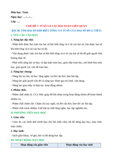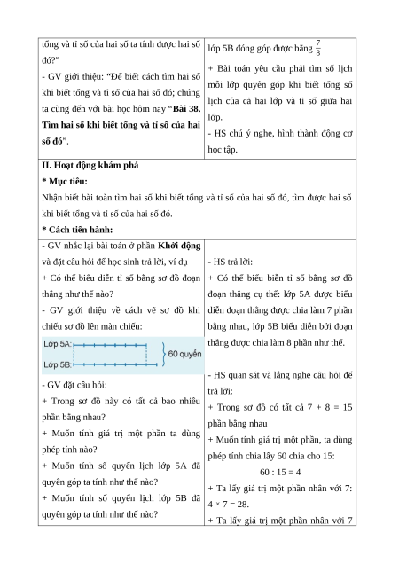 BÀI 38. TÌM HAI SỐ KHI BIẾT TỔNG VÀ TỈ SỐ CỦA HAI SỐ ĐÓ (2 TIẾT)
