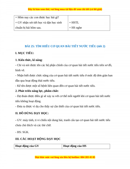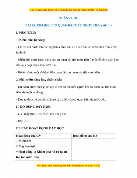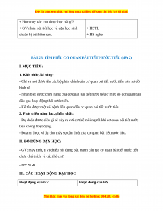 BÀI 25: TÌM HIỂU CƠ QUAN BÀI TIẾT NƯỚC TIỂU ( tiết 1 ) I. MỤC TIÊU: