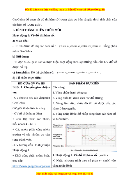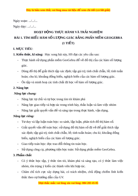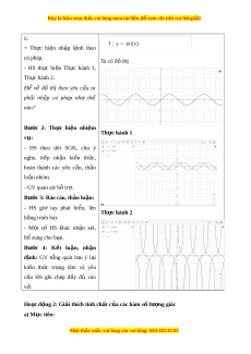 Đây là bản xem th , vu ử i lòng mua tài li u ệ đ xe ể m chi ti t ế (có l i ờ gi i ả ) Ngày so n ạ : .../.../... Ngày d y ạ : .../.../... HOẠT ĐỘNG TH C Ự HÀNH VÀ TR I Ả NGHI M Ệ BÀI 1. TÌM HI U Ể HÀM S Ố LƯ N Ợ G GIÁC B N Ằ G PH N Ầ M M Ề GEOGEBRA (1 TI T) Ế I. MỤC TIÊU: 1. Ki n ế th c