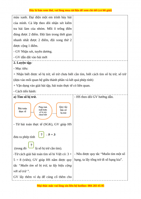 + Nhận biết được số bị trừ, số trừ chưa biết cần tìm, biết cách tìm số bị trừ, số trừ