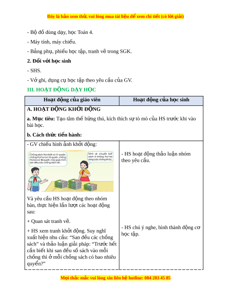 Đây là bản xem th , vu ử i lòng mua tài li u ệ đ xe ể m chi ti t (c ế ó l i ờ gi i ả ) - Bộ đồ dùng d y ạ , h c ọ Toán 4. - Máy tính, máy chi u. ế - B ng ả ph , phi ụ u h ế c t ọ p, ậ tranh v t ẽ rong SGK. 2. Đ i ố v i ớ h c s ọ inh - SHS. - Vở ghi, d ng c ụ h ụ c ọ t p t ậ heo yêu c u c ầ a ủ GV. III. HOẠT Đ N Ộ G D Y Ạ H C Ọ Hoạt đ ng c ộ a gi ủ áo viên Hoạt đ ng c ộ a h ủ c s ọ inh A. HOẠT Đ N Ộ G KH I Ở Đ N Ộ G a. Mục tiêu: T o t ạ âm th h ế ng t ứ