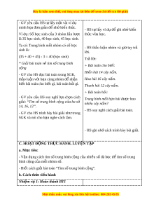 toán “Tìm số trung bình c ng”. ộ b. Cách th c t ứ i n hành: ế * Số trung bình c ng ộ - GV cho HS đ c ọ thông tin trong SGK, - HS th c hi ự n t ệ heo yêu c u G ầ V. chia sẻ v i ớ b n cùng nhóm ạ . - GV dẫn d t ắ giúp HS th o l ả u n ậ tìm ki m ế gi i