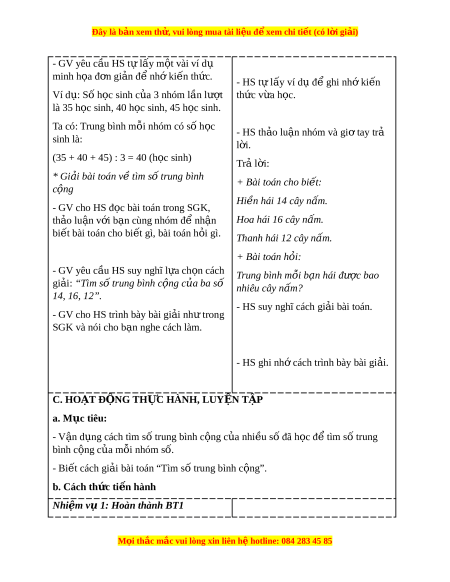 I. YÊU CẦU CẦN ĐẠT 1. Năng l c đ ự c t ặ hù: - Nh n bi ậ t ế được v s ề ố trung bình c ng c ộ a ủ nhi u s ề . ố - Bi t ế cách gi i ả bài toán “Tìm s t ố rung bình c ng” ộ và v n ậ d ng gi ụ i ả quy t ế m t ộ số vấn đ t ề ình huống đ n gi ơ n. ả - Phát tri n năng ể l c t ự duy và l ư p l ậ u n ậ toán h c, năng ọ l c gi ự i ả quy t ế v n đ ấ ề toán h c: ọ Thông qua vi c quan s ệ át, l p l ậ u n, t ậ h c ự hành, di n đ ễ t ạ khi h c ọ v ề d ng ạ toán tìm s t ố rung bình c ng. ộ - Phát tri n năng ể l c gi ự ao ti p t ế oán h c. ọ 2. Năng l c chung ự : - Năng l c t ự ch ự , ủ t h ự c: ọ l ng ắ nghe, tr l ả i ờ câu h i ỏ , làm bài t p. ậ - Năng l c gi ự i ả quy t ế v n đ ấ và s ề áng t o: ạ tham gia trò ch i ơ , v n d ậ ng, ụ sử d ng ụ các ki n t ế h c đã h ứ c ọ ng d ứ ng vào t ụ h c t ự , ế tìm tòi, phát hi n gi ệ i ả quy t ế các nhiệm v t ụ rong cu c s ộ ống. - Năng l c gi ự ao ti p và ế h p t ợ ác: ho t ạ đ ng ộ nhóm. 3. Phẩm ch t ấ : - Chăm ch : ỉ Chăm h c, ham ọ h c, ọ có tinh th n t ầ h ự c; ọ ch u khó đ ị c s ọ ách giáo khoa, tài li u và t ệ h c ự hi n các ệ nhi m ệ vụ cá nhân. - Trung th c: ự trung th c t ự rong th c hi ự n gi ệ i ả bài t p, ậ th c hi ự n nhi ệ m ệ v , ụ ghi chép và rút ra k t ế lu n. ậ - Yêu thích môn h c, s ọ áng t o, có ạ ni m ề h ng t ứ hú, say mê các con s đ ố gi ể i ả quy t ế bài toán. - Rèn luy n t ệ ính c n t ẩ h n, chí ậ nh xác, phát huy ý th c ch ứ đ ủ ng, ộ trách nhi m ệ và bồi dư ng s ỡ ự t t ự in, h ng t ứ hú trong vi c h ệ c. ọ II. Đ D Ồ ÙNG D Y Ạ H C Ọ 1. Đ i ố v i ớ giáo viên - Giáo án. M i