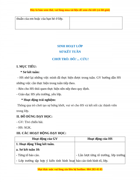 1. Hoạt động Tổng kết tuần. a. Sơ kết tuần 10: