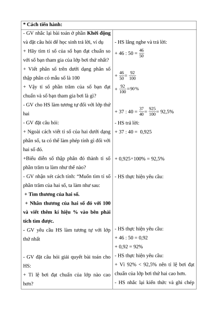 Nhận biết được tỉ số và tỉ số phần trăm của hai số. * Cách tiến hành: