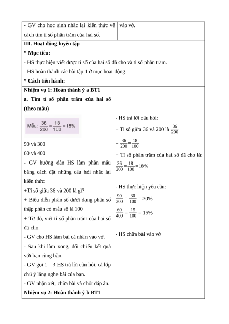 - HS thực hiện viết được tỉ số của hai số đã cho và tỉ số phần trăm.