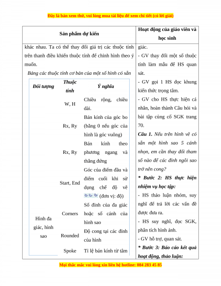 Bảng các thuộc tính cơ bản của một số hình có sẵn sát. Thuộc - GV gọi 1 HS đọc khung Đối tượng Ý nghĩa tính kiến thức trọng tâm. Chiều rộng, chiều - GV cho HS thực hiện cá W, H dài.