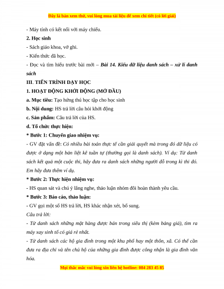 - Đọc và tìm hiểu trước bài mới – Bài 14. Kiểu dữ liệu danh sách – xử lí danh sách