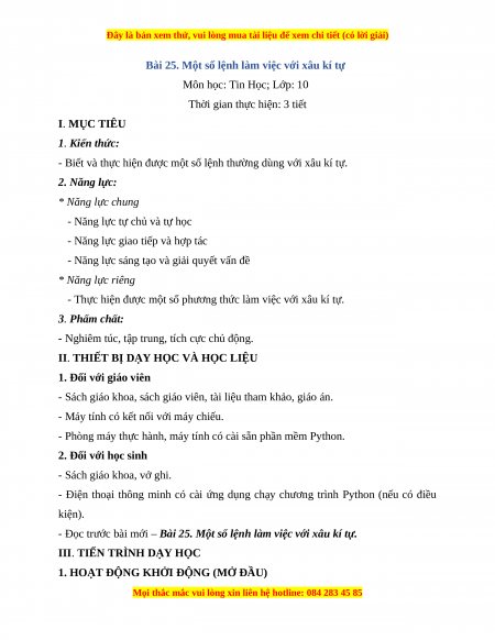 Giáo án Tin học 10 Bài 25 (Kết nối tri thức): Một số lệnh làm việc với xâu kí tự
