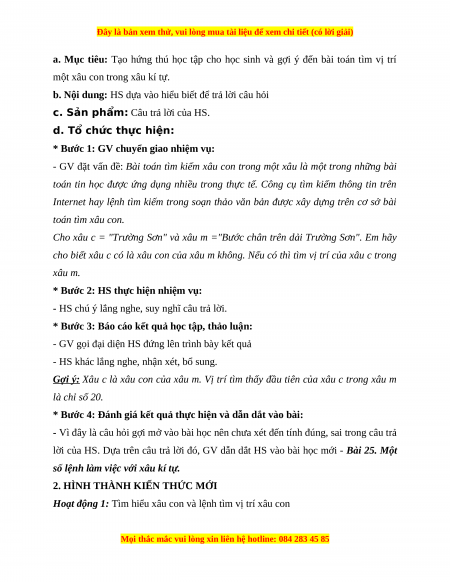 b. Nội dung: GV hướng dẫn HS tìm hiểu một số lệnh tìm kiếm xâu con trong xâu kí tự.