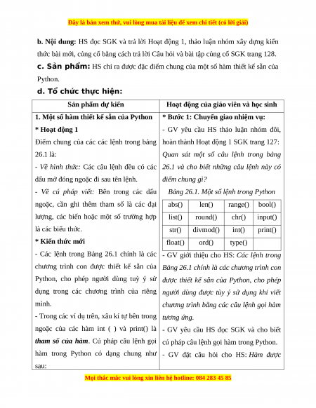 c. Sản phẩm: HS chỉ ra được đặc điểm chung của một số hàm thiết kế sẵn của Python.