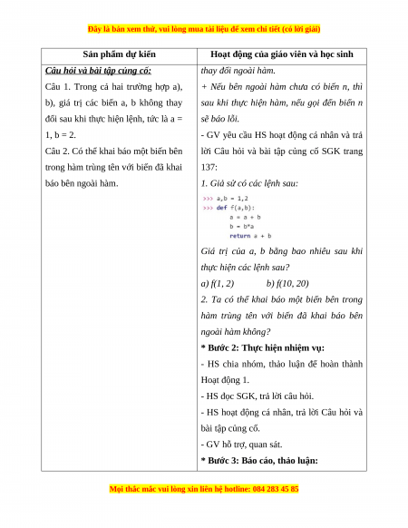c. Sản phẩm: HS nêu được phạm vi của biến khai báo bên trong hàm, trả lời