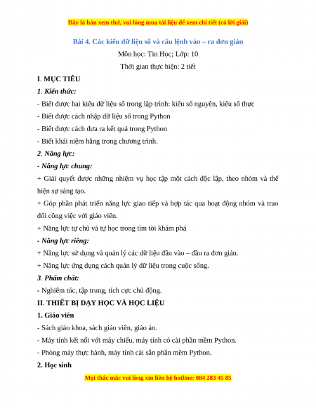Giáo án Tin học 10 Bài 4 (Cánh diều): Các kiểu dữ liệu số và câu lệnh vào - ra đơn giản