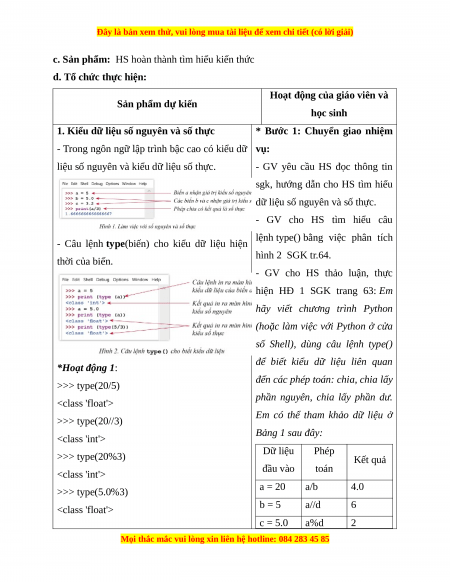 Em có thể tham khảo dữ liệu ở >>> type(20//3) Bảng 1 sau đây: Dữ liệu Phép >>> type(20%3) Kết quả đầu vào toán >>> type(5.0%3) a = 20 a/b 4.0 b = 5 a//d 6 c = 5.0 a%d 2