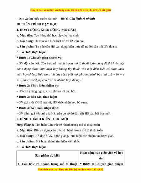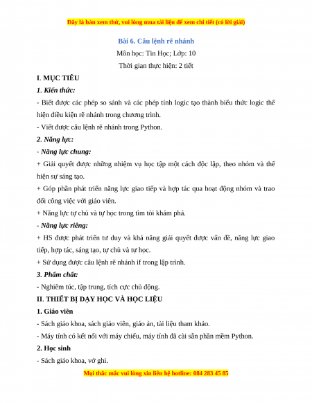 Giáo án Tin học 10 Bài 6 (Cánh diều): Câu lệnh rẽ nhánh