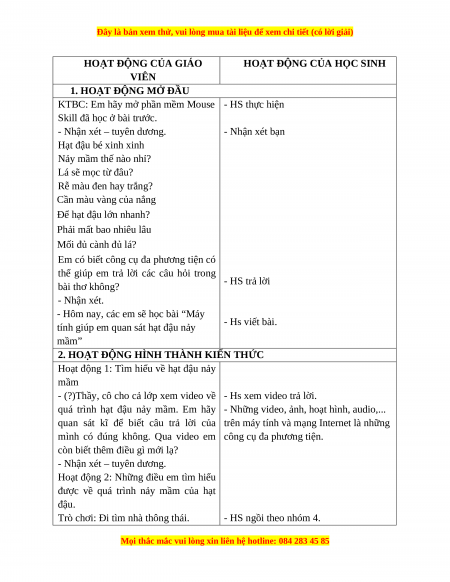 1. Giáo viên: Máy tính, máy chiếu, sách giáo khoa, video hạt đậu nảy mầm.