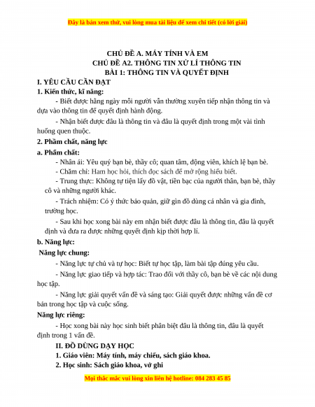 - Học xong bài này học sinh biết phân biệt đâu là thông tin, đâu là quyết định trong 1 vấn đề. II. ĐỒ DÙNG DẠY HỌC