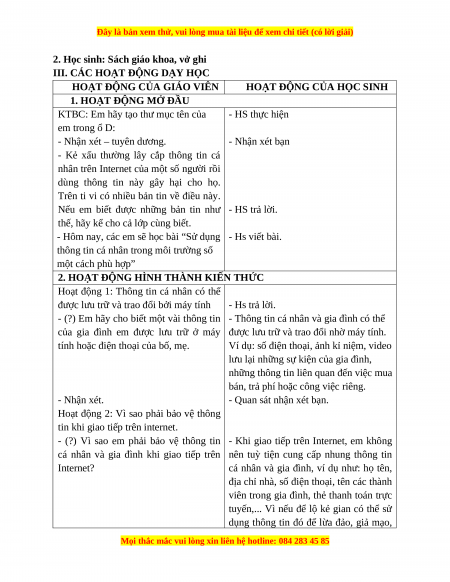 Giáo án Tin học 3 Cánh diều Bài 4: Sử dụng thông tin cá nhân trong môi trường một cách phù hợp