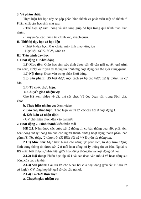 Giáo án Tin học 6 Bài 2 (Kết nối tri thức): Xử lí thông tin