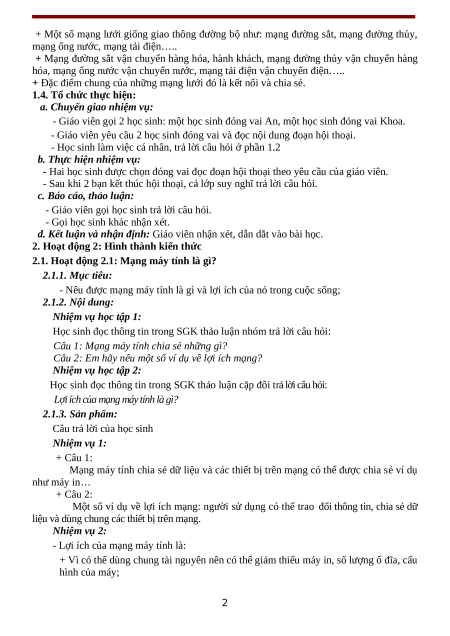 Mạng máy tính chia sẻ dữ liệu và các thiết bị trên mạng có thể được chia sẻ ví dụ như máy in… + Câu 2: