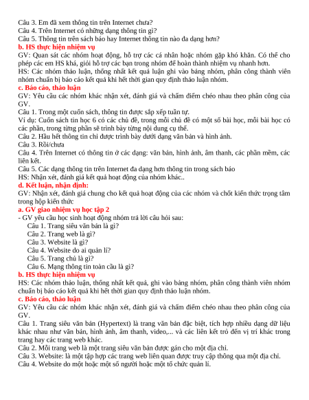 Câu 2. Hầu hết thông tin chỉ được trình bày dưới dạng văn bản và hình ảnh. Câu 3. Rồi/chưa