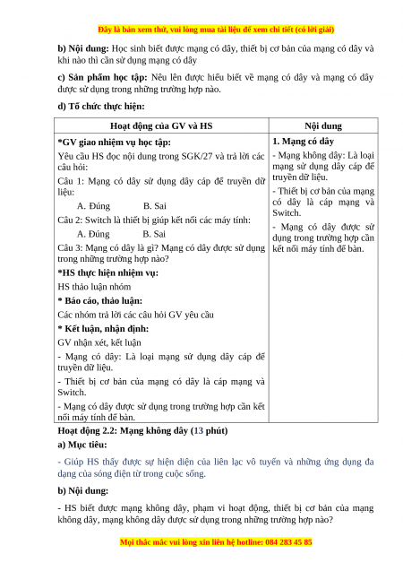 b) Nội dung: Học sinh biết được mạng có dây, thiết bị cơ bản của mạng có dây và