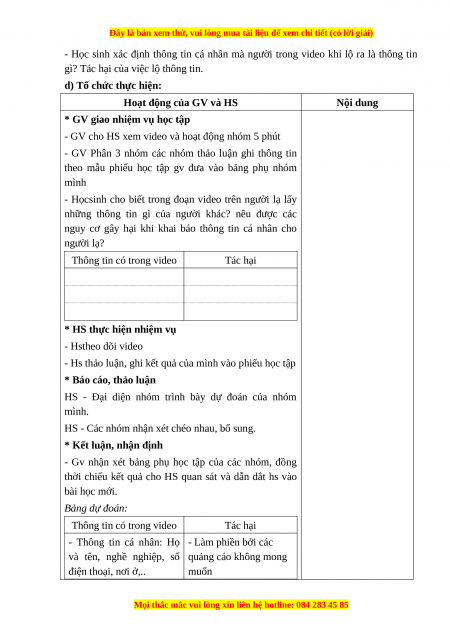 - Học sinh xác định thông tin cá nhân mà người trong video khi lộ ra là thông tin