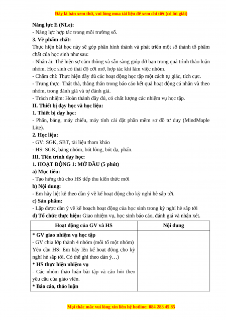- Lập được dàn ý về kế hoạch hoạt động của học sinh trong kỳ nghỉ hè sắp tới
