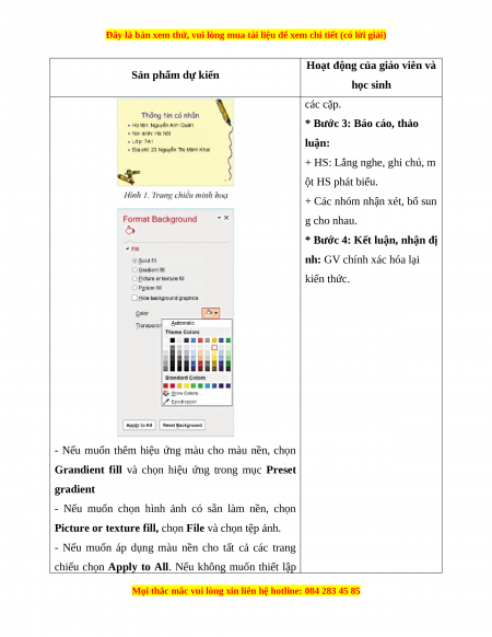 Bài 1. Lựa chọn màu nền cho trang chiếu cho trang chiếu? Nêu cách Hướng dẫn chọn màu nền cho trang