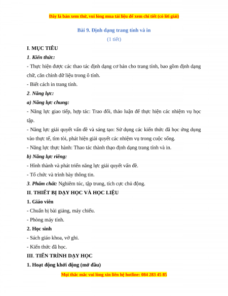 Bài 9. Định dạng trang tính và in (1 tiết) I. MỤC TIÊU