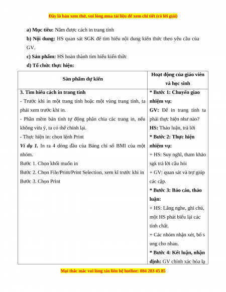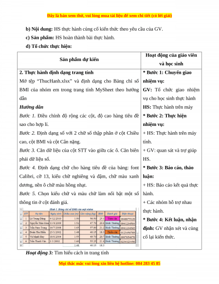 - Năng lực thực hành: Thao tác thành thạo định dạng trang tính và in.