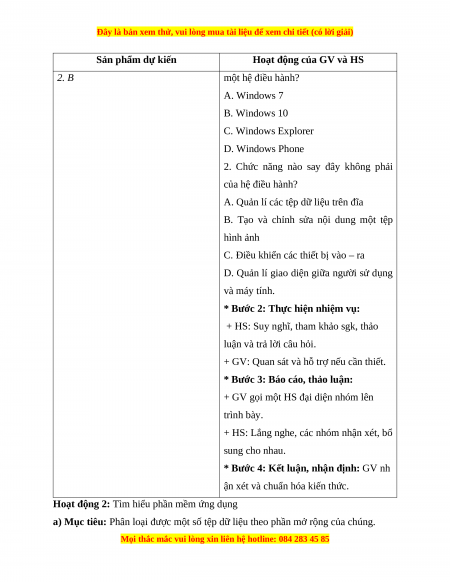 Hoạt động của GV và HS 2. B một hệ điều hành? A. Windows 7 B. Windows 10 C. Windows Explorer D. Windows Phone