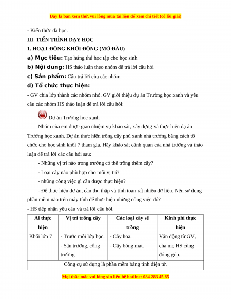 án Trường học xanh để GV có thể dùng minh họa trong khi dạy học). 2. Học sinh - Sách giáo khoa, vở ghi.
