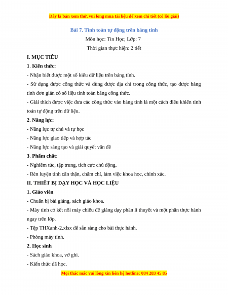 Giáo án Tin học 7 Kết nối tri thức Chủ đề 4 Bài 7 Tính toán tự động trên bảng tính