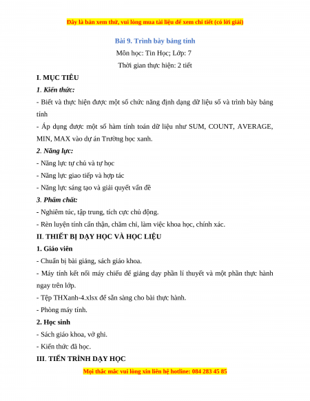 Giáo án Tin học 7 Kết nối tri thức Chủ đề 4 Bài 9 Trình bày bảng tính