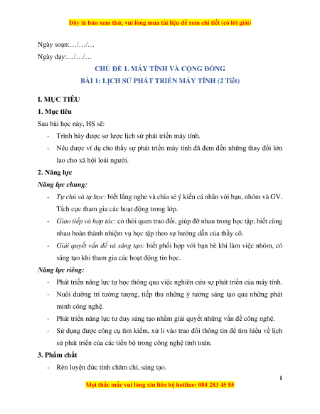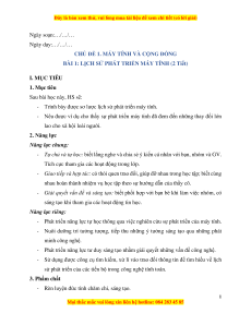 BÀI 1: LỊCH SỬ PHÁT TRIỂN MÁY TÍNH (2 Tiết) I. MỤC TIÊU 1. Mục tiêu Sau bài học này, HS sẽ: