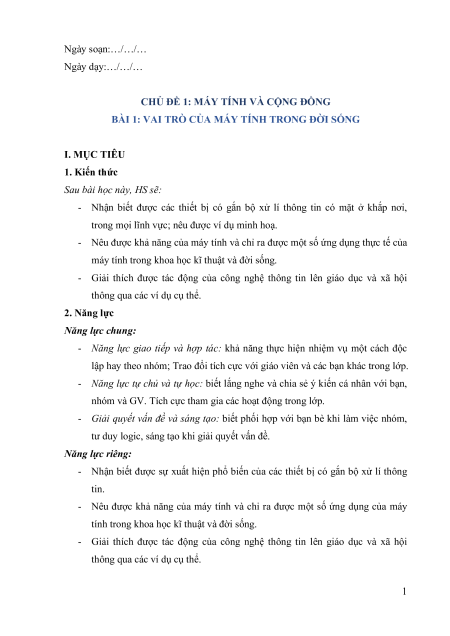 BÀI 1: VAI TRÒ CỦA MÁY TÍNH TRONG ĐỜI SỐNG I. MỤC TIÊU 1. Kiến thức