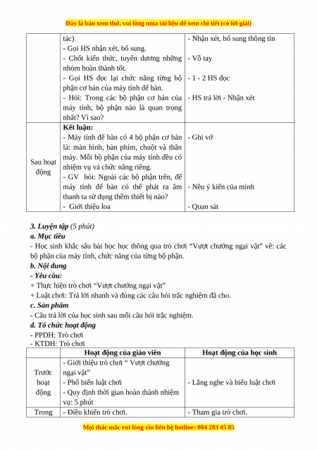 - Nhận diện và phân biệt được các bộ phận của máy tính để bàn: màn hình, thân máy, bàn phím, chuột. b. Nội dung