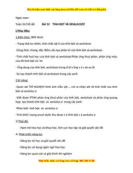 Tuần 34,Tiết 68 Bài 52 TINH BỘT VÀ XENLULOZƠ I/Mục tiêu: