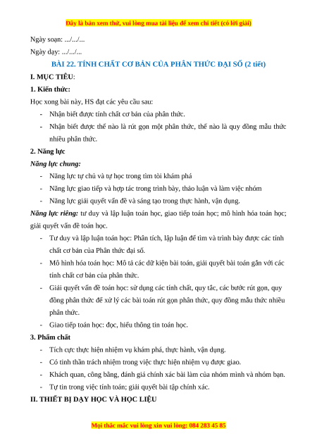 BÀI 22. TÍNH CHẤT CƠ BẢN CỦA PHÂN THỨC ĐẠI SỐ (2 tiết) I. MỤC TIÊU: