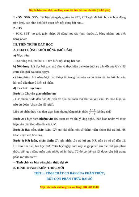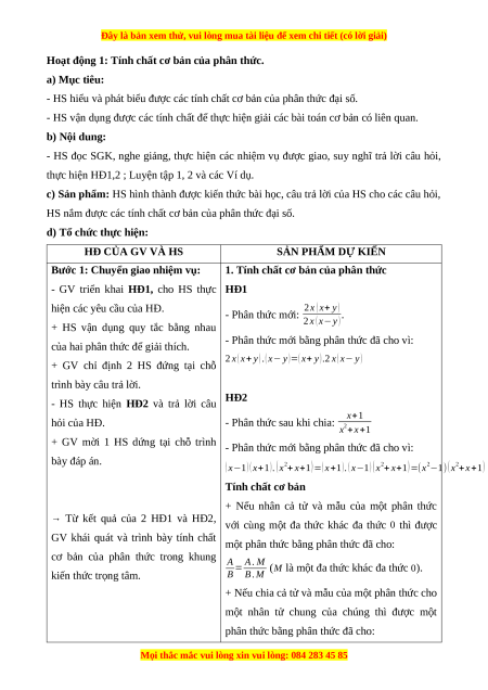 - HS hiểu và phát biểu được các tính chất cơ bản của phân thức đại số.