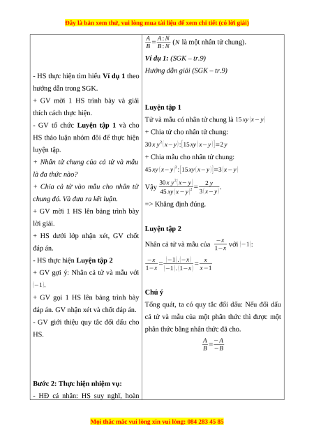 - GV tổ chức Luyện tập 1 và cho + Chia tử cho nhân tử chung: