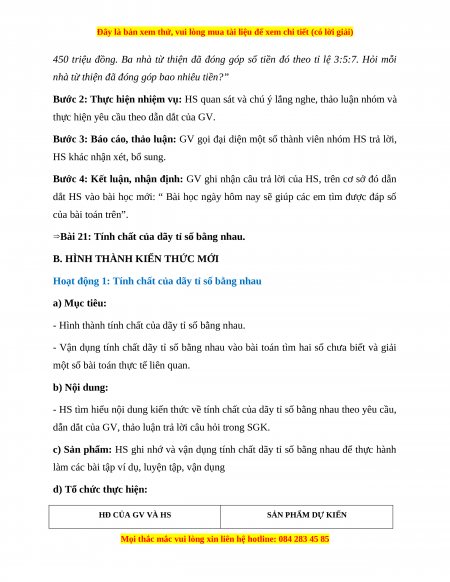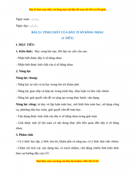 BÀI 21: TÍNH CHẤT CỦA DÃY TỈ SỐ BẰNG NHAU (1 TIẾT) I. MỤC TIÊU: