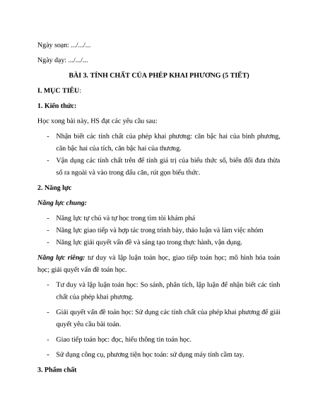 BÀI 3. TÍNH CHẤT CỦA PHÉP KHAI PHƯƠNG (5 TIẾT) I. MỤC TIÊU: