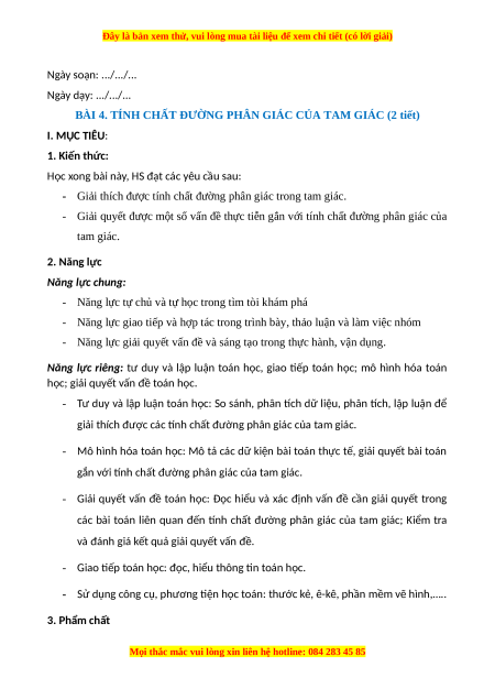 BÀI 4. TÍNH CHẤT ĐƯỜNG PHÂN GIÁC CỦA TAM GIÁC (2 tiết) I. MỤC TIÊU: 1. Kiến thức: