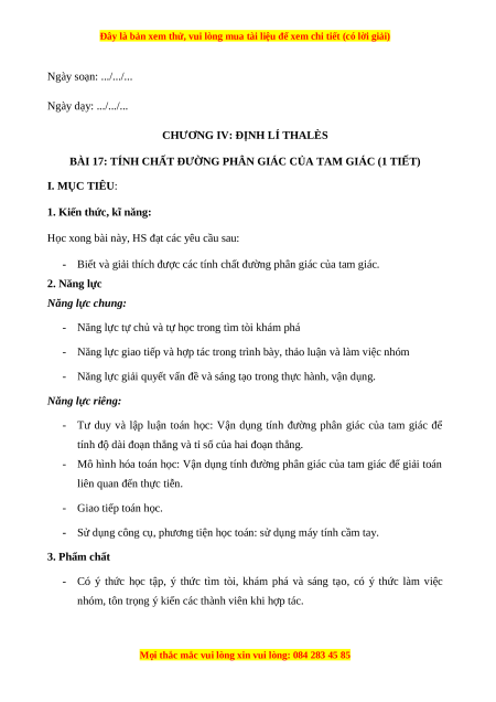 BÀI 17: TÍNH CHẤT ĐƯỜNG PHÂN GIÁC CỦA TAM GIÁC (1 TIẾT) I. MỤC TIÊU: