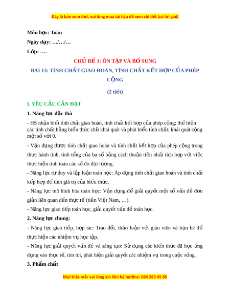 ữ khái quát và phát bi u t ể ính ch t ấ ; khái quát c ng ộ m t ộ số v i ớ 0. - V n ậ d ng ụ đư c ợ tính ch t ấ giao hoán và tính ch t ấ k t ế h p ợ c a ủ phép c ng ộ trong th c ự hành tính, tính t ng ổ c a ủ ba số b ng ằ cách thu n ậ ti n ệ nh t ấ tích h p ợ v i ớ vi c ệ th c ự hi n t ệ ính toán các s đo đ ố i ạ lư ng. ợ - Năng l c ự tư duy và l p ậ lu n ậ toán h c: ọ Áp d ng ụ tính ch t ấ giao hoán và tính ch t ấ k p h ế p ợ đ t ể ính giá tr c ị a ủ bi u ể th c. ứ - Năng l c ự mô hình hóa toán h c: ọ V n ậ d ng ụ để gi i ả quy t ế m t ộ số v n ấ đ ề đ n ơ gi n ả liên quan đ n t ế h c t ự ( ế ti n ề Vi t ệ Nam, …). - Năng l c gi ự ao ti p t ế oán h c, gi ọ i ả quy t ế v n đ ấ t ề oán h c. ọ 2. Năng l c chung ự : - Năng l c ự giao ti p, ế h p ợ tác: Trao đ i ổ , th o ả lu n ậ v i ớ giáo viên và b n ạ bè để th c ự hi n các ệ nhi m ệ vụ h c t ọ p. ậ - Năng l c ự gi i ả quy t ế v n ấ đề và sáng t o: ạ Sử d ng ụ các ki n ế th c ứ đã h c ọ ng ứ d ng vào ụ th c t ự , t ế ìm tòi, phát hi n gi ệ i ả quy t ế các nhi m ệ v t ụ rong cu c s ộ ng. ố 3. Phẩm ch t ấ