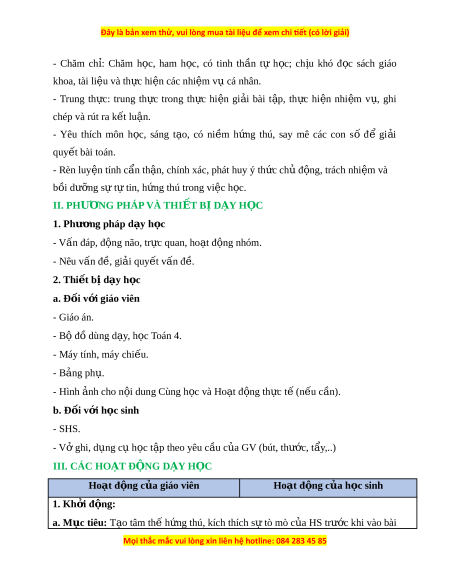 ứ thú, say mê các con số để gi i ả quy t ế bài toán. - Rèn luy n t ệ ính c n t ẩ h n, chí ậ nh xác, phát huy ý th c ch ứ đ ủ ng, ộ trách nhi m ệ và bồi dư ng s ỡ ự t t ự in, h ng t ứ hú trong vi c h ệ c. ọ II. PHƯ N Ơ G PHÁP VÀ THI T Ế B D Ị Y Ạ H C Ọ 1. Phư ng ơ pháp d y h ạ c ọ - Vấn đáp, đ ng ộ não, tr c ự quan, ho t ạ đ ng nhóm ộ . - Nêu vấn đ , gi ề i ả quy t ế v n đ ấ . ề 2. Thi t ế b d ị y h ạ c ọ a. Đ i ố v i ớ giáo viên - Giáo án. - Bộ đồ dùng d y ạ , h c ọ Toán 4. - Máy tính, máy chi u. ế - B ng ả ph . ụ - Hình nh cho ả n i ộ dung Cùng h c ọ và Ho t ạ đ ng t ộ h c ự t ( ế n u ế c n) ầ . b. Đ i ố v i ớ h c s ọ inh - SHS. - Vở ghi, d ng c ụ h ụ c ọ t p t ậ heo yêu c u c ầ a ủ GV (bút, thư c, t ớ ẩy,..) III. CÁC HO T Ạ Đ N Ộ G D Y Ạ H C Ọ Hoạt đ ng c ộ a gi ủ áo viên Hoạt đ ng c ộ a h ủ c s ọ inh 1. Kh i ở đ ng: ộ a. Mục tiêu: T o t ạ âm th h ế ng t ứ