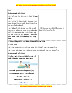 m phá, hình thành ki n t ế h c ứ m i ớ a. Mục tiêu: - HS làm quen v i ớ tính ch t ấ giao hoán, tính ch t ấ k t ế h p c ợ a ủ phép c ng. ộ - HS nh n ậ bi t ế đư c t ợ ính ch t ấ giao hoán, tính ch t ấ k t ế h p c ợ a ủ phép c ng. ộ b. Cách th c t ứ i n hành: ế Nhi m ệ v 1 ụ : Khám phá ki n t ế h c v ứ ề tính ch t ấ giao hoán c a p ủ hép c ng ộ Tính ch t ấ giao hoán c a p ủ hép c ng ộ