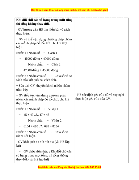 Khi đ i ổ ch các s ỗ h ố ng t ạ rong m t ộ t ng ổ thì t ng khô ổ ng thay đ i ổ . - GV hư ng d ớ ẫn HS tìm hi u bài ể và cách th c hi ự ện. + GV có thể v n d ậ ng ph ụ ư ng ơ pháp nhóm các m nh ả ghép đ t ể ổ ch c cho H ứ S th c ự hiện. Bư c ớ 1 : Nhóm l ẻ → Cách 1